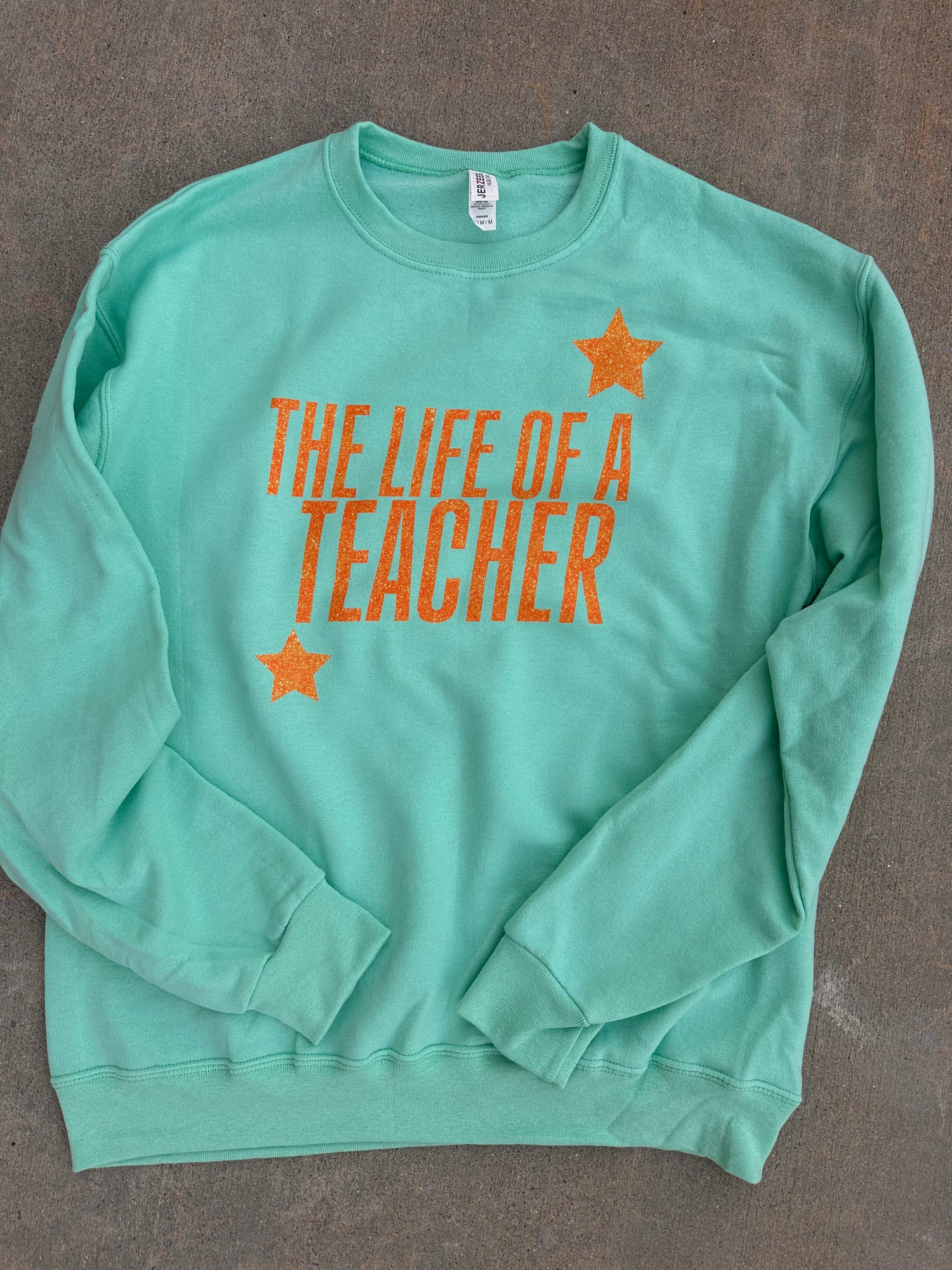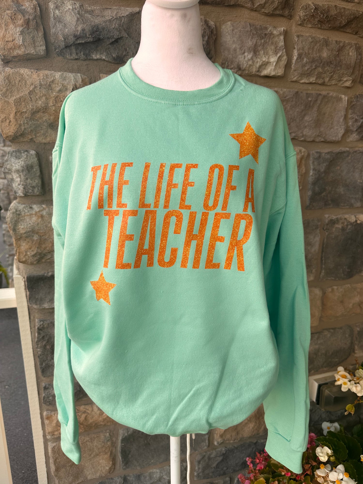Mint green sweatshirt(jerzees brand) with” In my Teacher Era”. The font is a faux glitter print.